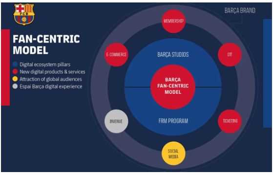 Uma das principais inovações dessa estratégia é o pilar de FRM, como visto no gráfico a seguir. FRM é a abreviação de Fan Relationship Management, uma versão voltada para o futebol dos programas de relacionamento com o consumidor, CRM. Este tipo de solução tem como objetivo concentrar os dados dos torcedores em uma única plataforma, auxiliando na análise e no desenvolvimento de produtos e serviços de acordo com as preferências dos fãs.