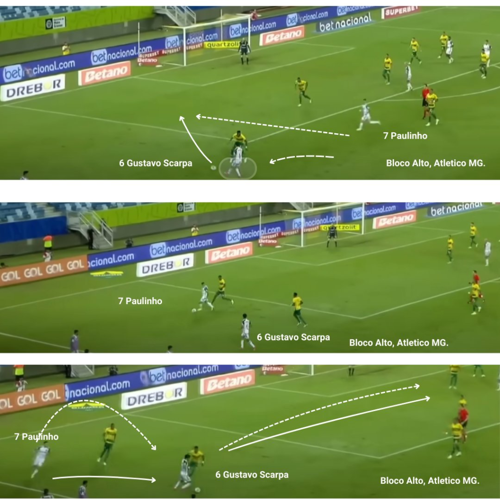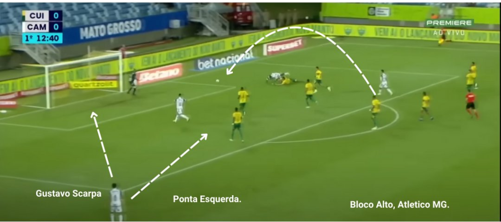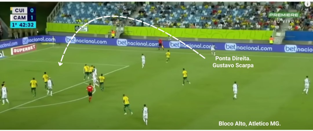 Agora na ponta direita, Gustavo Scarpa mostra que seu papel é conectar sua equipe já postada no ataque aos 42 minutos em bloco alto. Veja que sua função em campo é buscar a melhor opção de definição da jogada, um armador. Sem pressão, Scarpinha toma a decisão do lance.