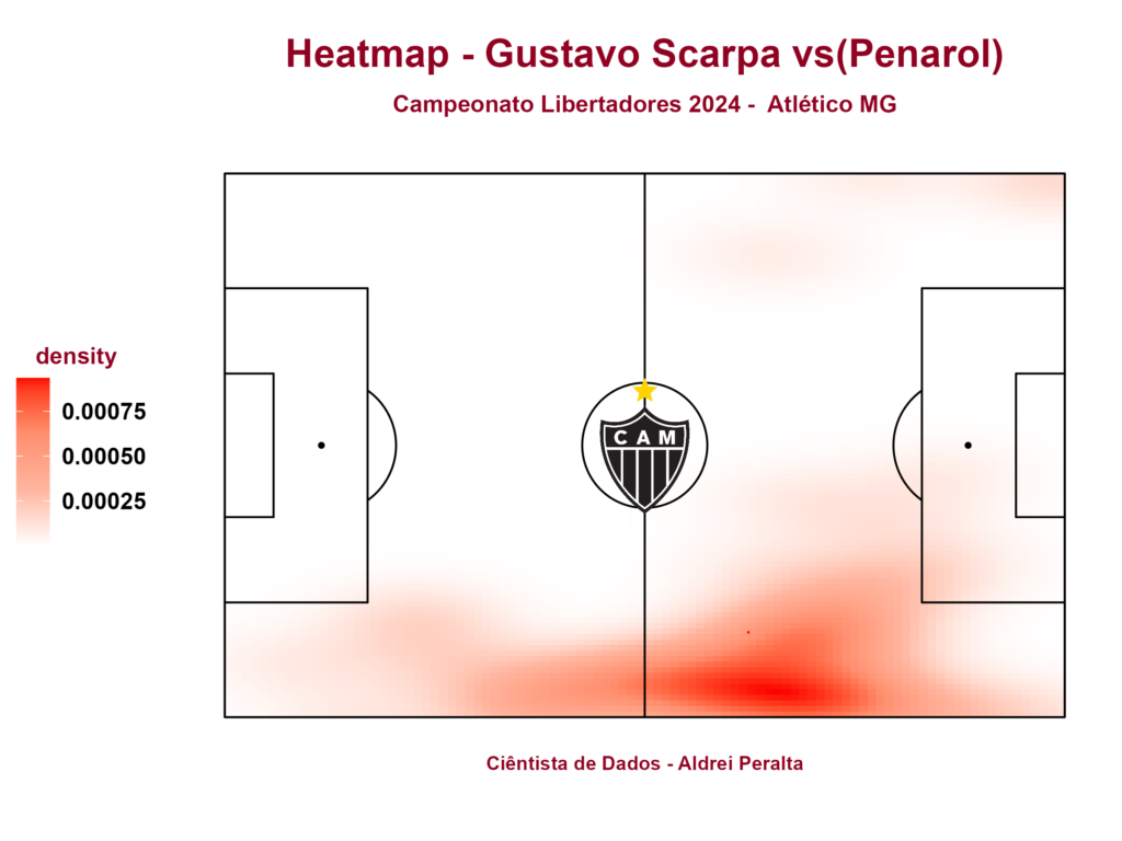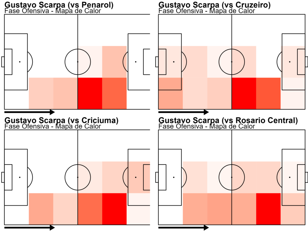 Através dos dados podemos notar uma movimentação repetitiva padronizada do atleta do atleta Gustavo Scarpa. O Scarpinha disputou 4 partidas diante de Cruzeiro, Criciúma, Rosario Central e Cruzeiro de novo. Iremos visualizar os mapas através do pacote SoccerMatics usado no Software Rstudio o pacote criado por David Sumpter. Ele se divide em parcelas com taxas de frequência de intensidade de acordo com a movimentação em campo. Podemos citar o uso das parcelas semelhante ao plantio de agro na produção industrial de colheita como visto na análise de planejamento dos dados. Muito famosa com a teoria Sir Ronald Fisher um dos fundadores da Estatística moderna em 1920.