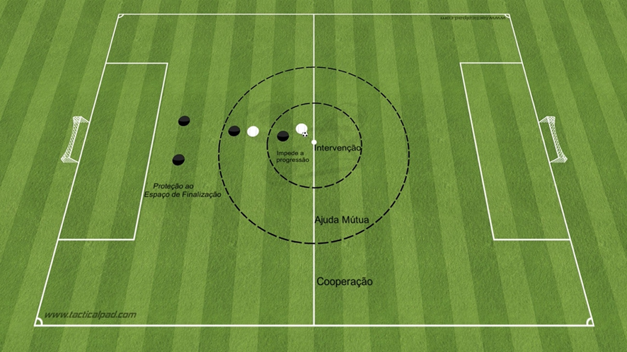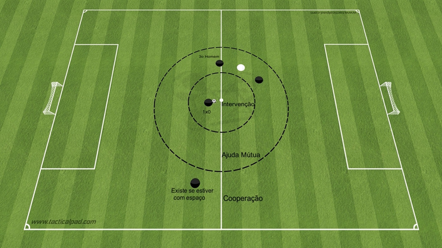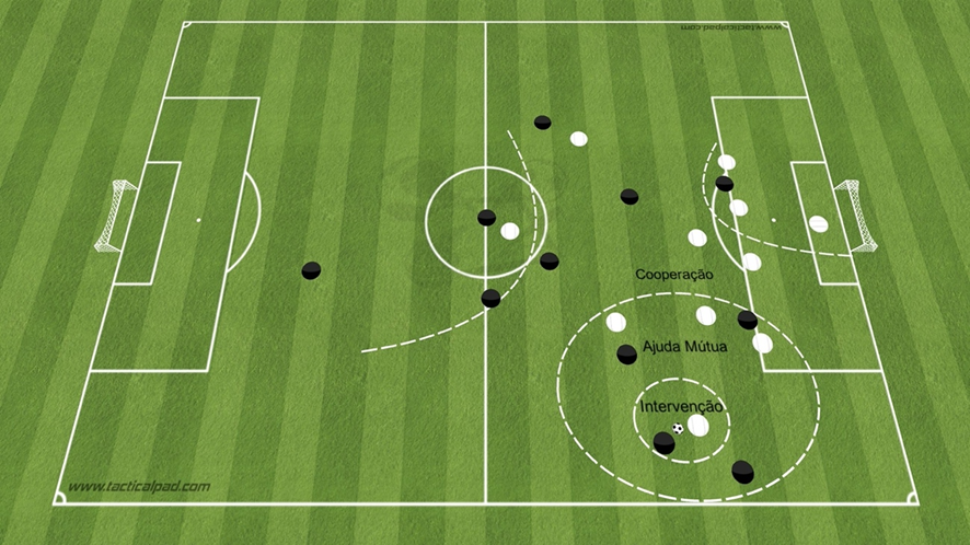 Para se ter controle sobre esta análise e saber quais vantagens se tem ou não, esta metodologia criou os espaços de fase e este tópico divide o campo em três zonas: de intervenção (onde os jogadores têm a possibilidade iminente de atuar naquele instante sobre a bola), de ajuda mútua (se destaca por ser o espaço em que os jogadores podem intervir em um espaço de tempo extremamente curto e com poucos ajustes) e de cooperação (espaço para além da ajuda mútua). Vemos abaixo os espaços e alguns exemplos das vantagens inerentes aos espaços: